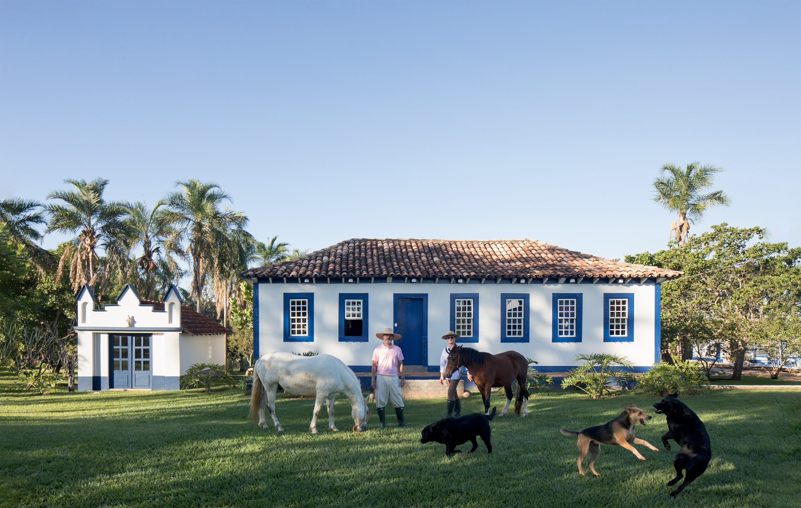Do mobiliário original, só restou um banco na chapelaria. “Compus tudo de forma muito livre, sem regras, com objetos que faziam parte do meu cotidiano e tinham sinergia com a fazenda”, detalha. A casa pedia cor e tinha, no passado, um tom de amarelo desbotado com verde, que parecia jamais ter sido retocado. Os afrescos internos caíram no dia em que a residência foi colocada no eixo: “Aquele foi um momento simbólico, para começar um ciclo novo”. Agora em branco e azul, ela segue a arquitetura colonial goiana com forros pintados – o da cozinha, de laranja, acompanhando o piso de cimento queimado amarelo. Ali, ele prepara comidinhas ao lado do marido, o arquiteto Marcelo José Trento Costa, no mesmo ritmo em que a obra foi feita, sem pressa, com equipe pequena. “Quando estamos aqui, à noite, desligamos todas as luzes e sentamos na praça da lareira. Dali, contemplamos o céu estrelado que podemos chamar de nosso infinito particular”, compartilha Marcelo.