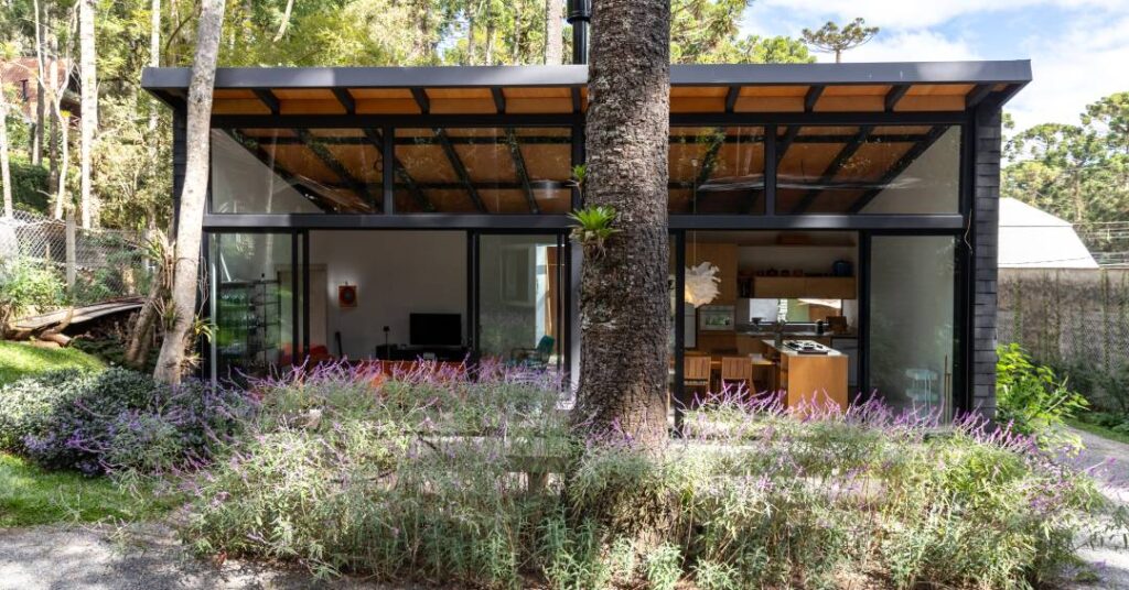 O projeto consiste em duas casas independentes – a principal e a de hóspedes –, cada uma dividida em dois blocos: social (sala e cozinha) e íntimo (com dois dormitórios). A dupla de volumes é conectada por um hall de entrada em estrutura metálica recoberto por folhas de vidro, que ampliam a entrada de luz no interior das casas e contrasta com a cor escura do exterior.