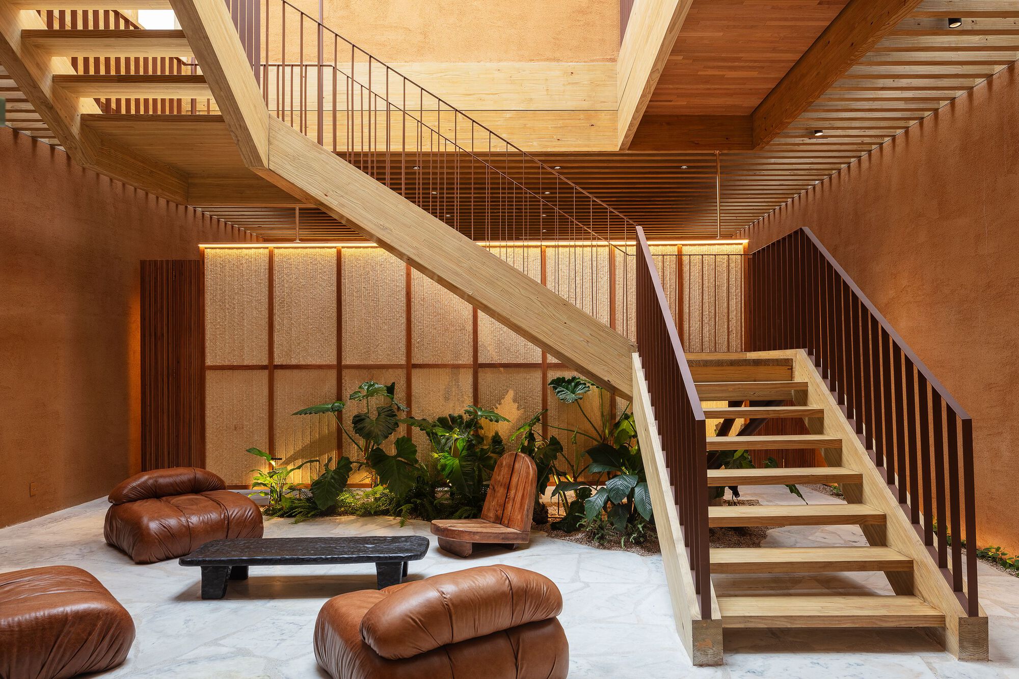 Duas paredes revestidas com terra crua recebem uma estrutura feita com peças idênticas em Madeira Laminada Colada (MLC), criando um protagonismo ritmado para a estrutura aparente, que sustenta pavimento superior. O pavimento superior está apoiado sobre as vigas de madeira, e afastado das paredes laterais o suficiente para permitir a entrada da luz do sol, banhando as duas paredes de terra.