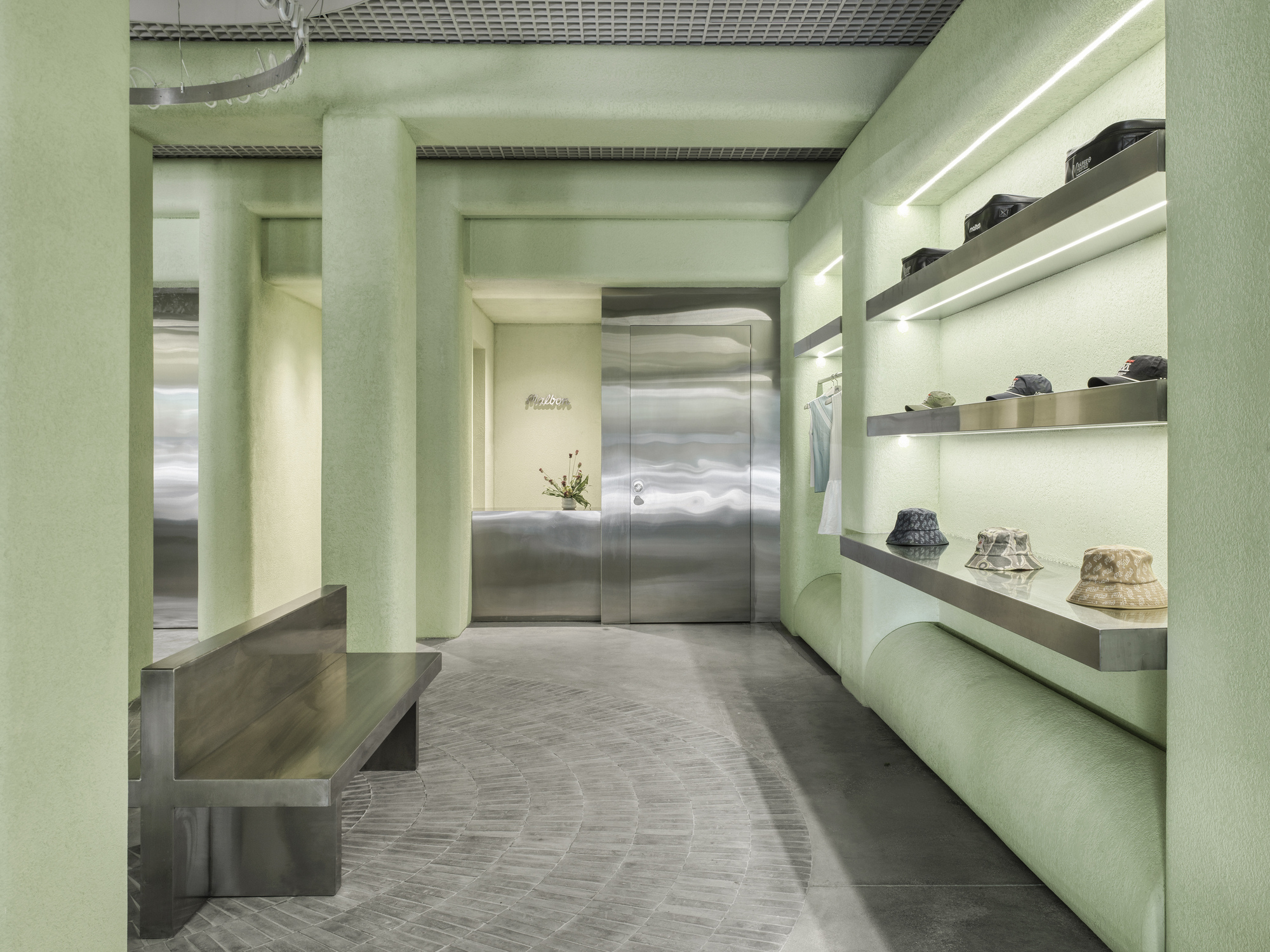 Como em todos os projetos da 22RE, móveis e peças sob medida estão presentes em todo o ambiente. Destacam-se os bancos de aço inoxidável, projetados pelo estúdio, posicionados no centro da loja. Pesados e geométricos, eles trazem sensação de enraizamento e contrastam com a leveza sugerida pela paleta cromática.