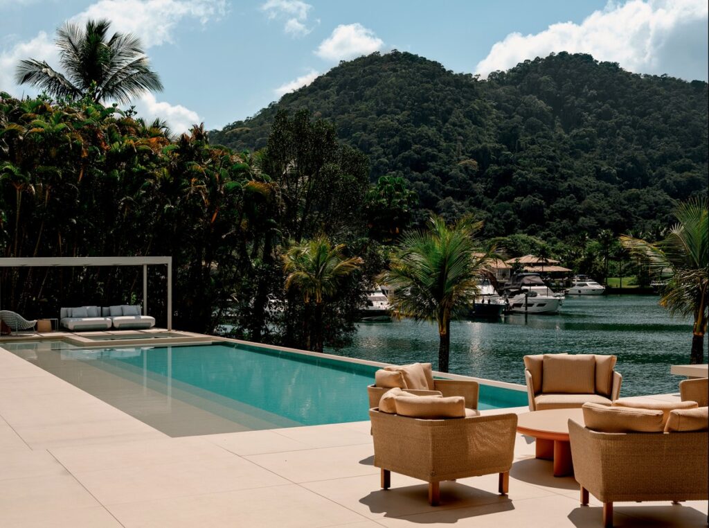 Na área externa, figuram sofás Harbour, poltronas Shito e mesa de centro Nesso, todos da Paola Lenti, e mesas laterais Coso, design Henrik Pedersen para a Gloster, tudo na Casual Móveis, sobre o piso e diante dos brises feitos de Dekton e executados pela Pedras Bellas Artes – o forro de tauari tingido é da Arali Móveis