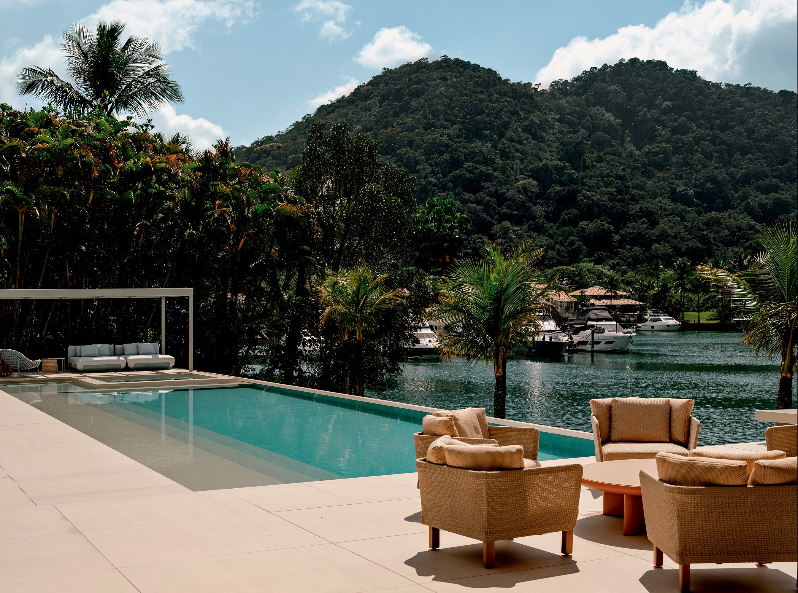 A área da piscina foi ambientada com espreguiçadeiras Kobo, design Stephane De Winter para a Manutti, e mesas laterais Strap, da Paola Lenti, tudo na Casual Móveis