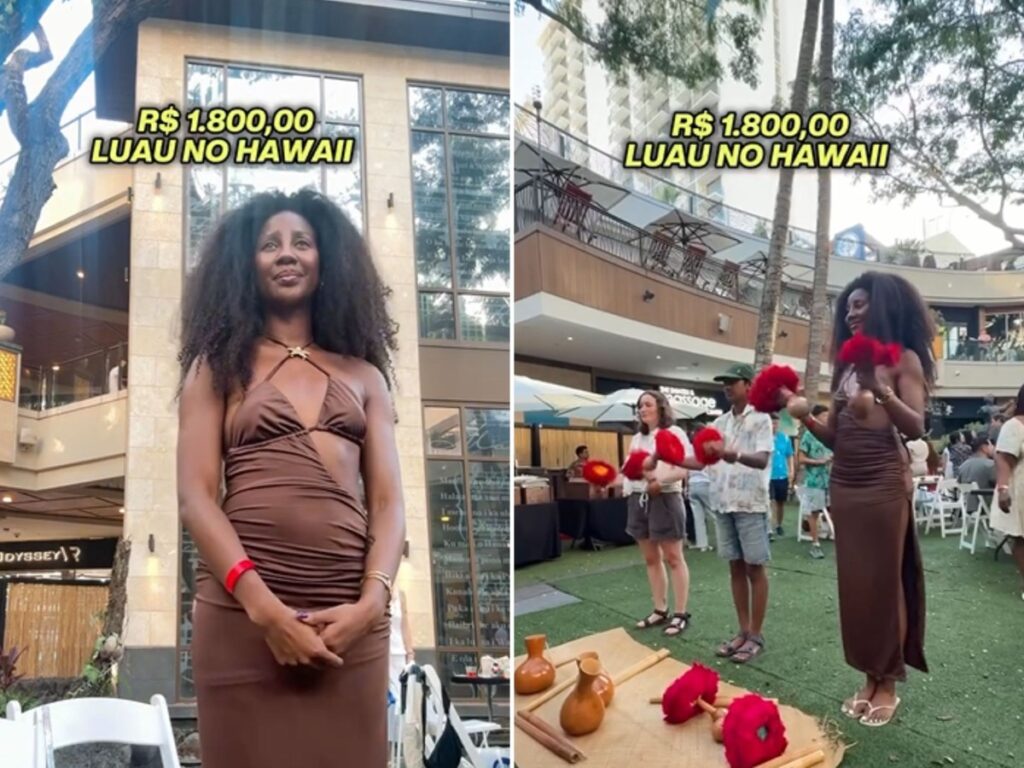 Organizado na praça central de um shopping, o evento não saiu como esperado, com ela admitindo que “a ficha caiu”. “Está no Havaí, tem que ir ao luau. Então, vou mostrar para vocês. Luau na praia? Não, amor. Quando a gente chegou lá era dentro de um shopping. E o pior, que ódio, é que a gente pagou US$ 300 e quem estava lá em cima, amor, no segundo andar conseguia ver o luau todinho custando 0 dólares”, disse.
