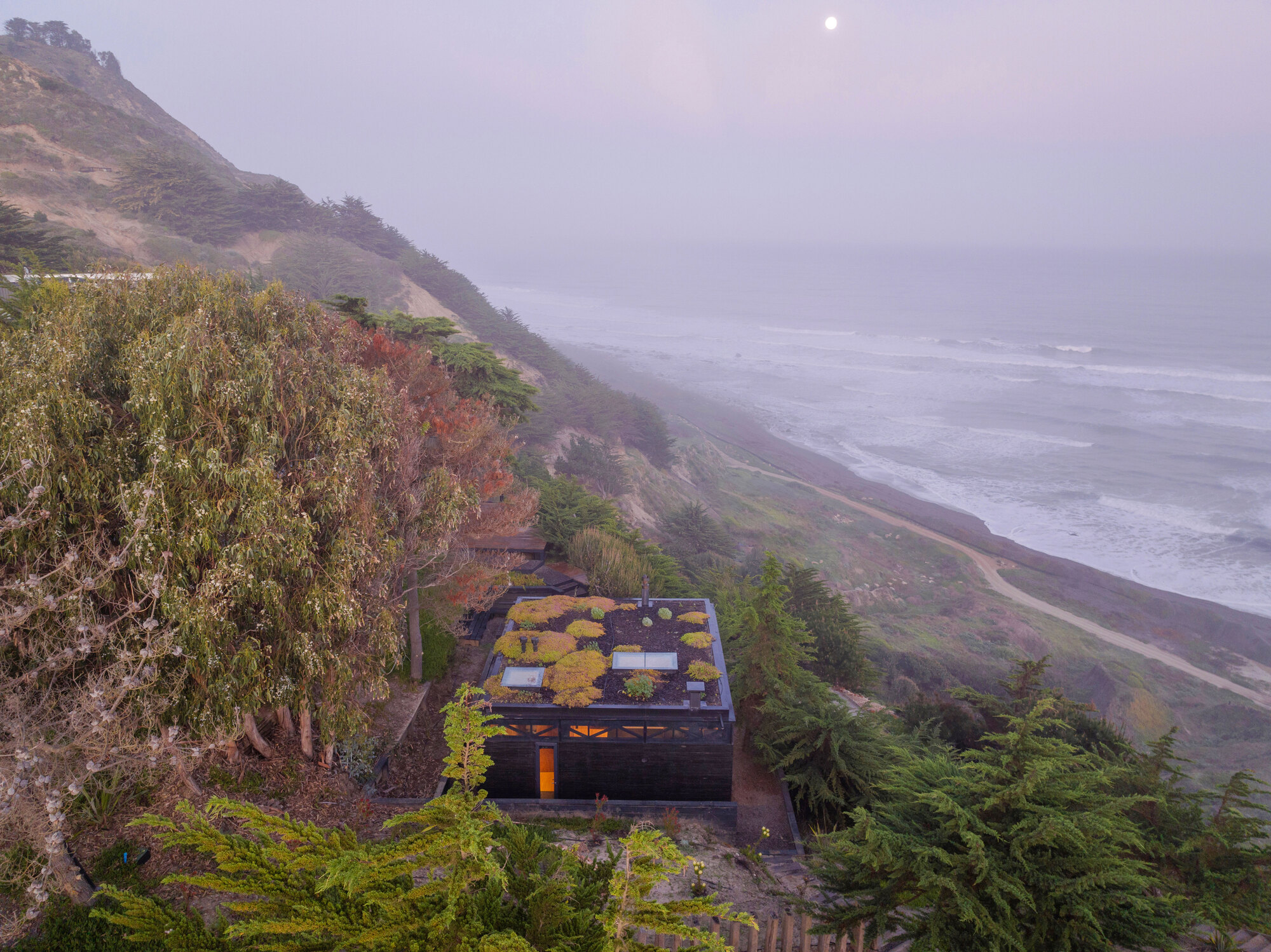 A fachada voltada para o mar se abre completamente por meio de amplas janelas deslizantes, permitindo que o interior se converta em um espaço aberto, plenamente integrado à paisagem. Essa característica reforça a conexão com a tradição chilena do quincho, aqui reinterpretada sob uma perspectiva contemporânea: um ambiente em que cozinhar, conviver e habitar se entrelaçam com o exterior. Em contraste, as fachadas posteriores e laterais, revestidas com tábuas de pinus escurecidas, preservam um caráter mais fechado, assegurando privacidade em relação à casa principal e às propriedades vizinhas.