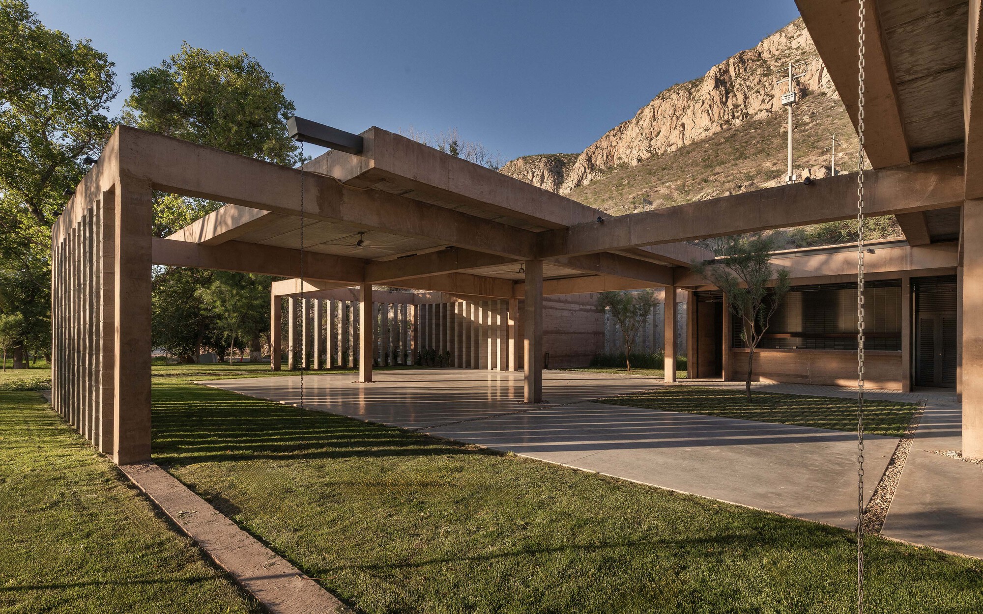 A matéria-prima em diferentes formatos é o concreto. Os elementos estruturais feitos no local foram pigmentados em cor terra, enquanto os pré-fabricados como blocos, paver e o sistema de laje alveolar foram trabalhados na cor natural, buscando criar um lugar acolhedor e atemporal que se mimetize com a paisagem.