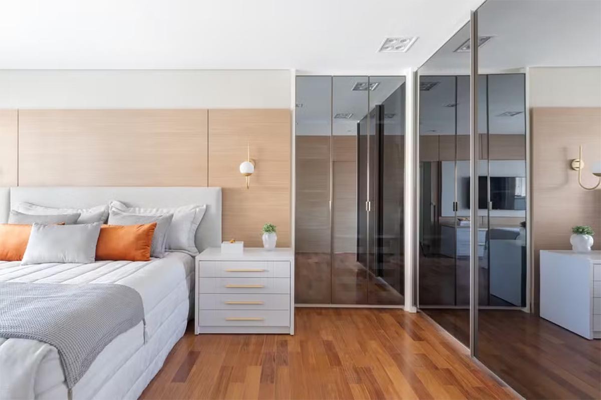 Nesse sentido, o tamanho da cama tem muito a dizer… e não parece ser compatível com a ideia de tornar os cômodos menores. “Assim como é cada vez mais comum os clientes desejarem o quarto apenas para dormir, também estão optando por camas maiores. Nos quartos principais, a cama de 1,35 m ou 1,40 m, que era padrão na Espanha, está sendo substituída por modelos maiores, de 1,60 m até 2×2 metros. Isso naturalmente impacta na metragem necessária do cômodo. O mais importante é garantir uma boa circulação ao redor da cama, não apenas para se deitar com facilidade, mas também para arrumar a cama com conforto. O ideal é ter uma passagem de 60 cm ao redor, o que coloca a metragem mínima de um quarto confortável entre 7 e 10 m², sem contar o espaço de armazenamento”, finaliza a arquiteta.