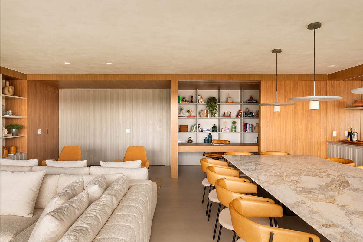 A cozinha em tons de bege mineral se abre para a sala de estar