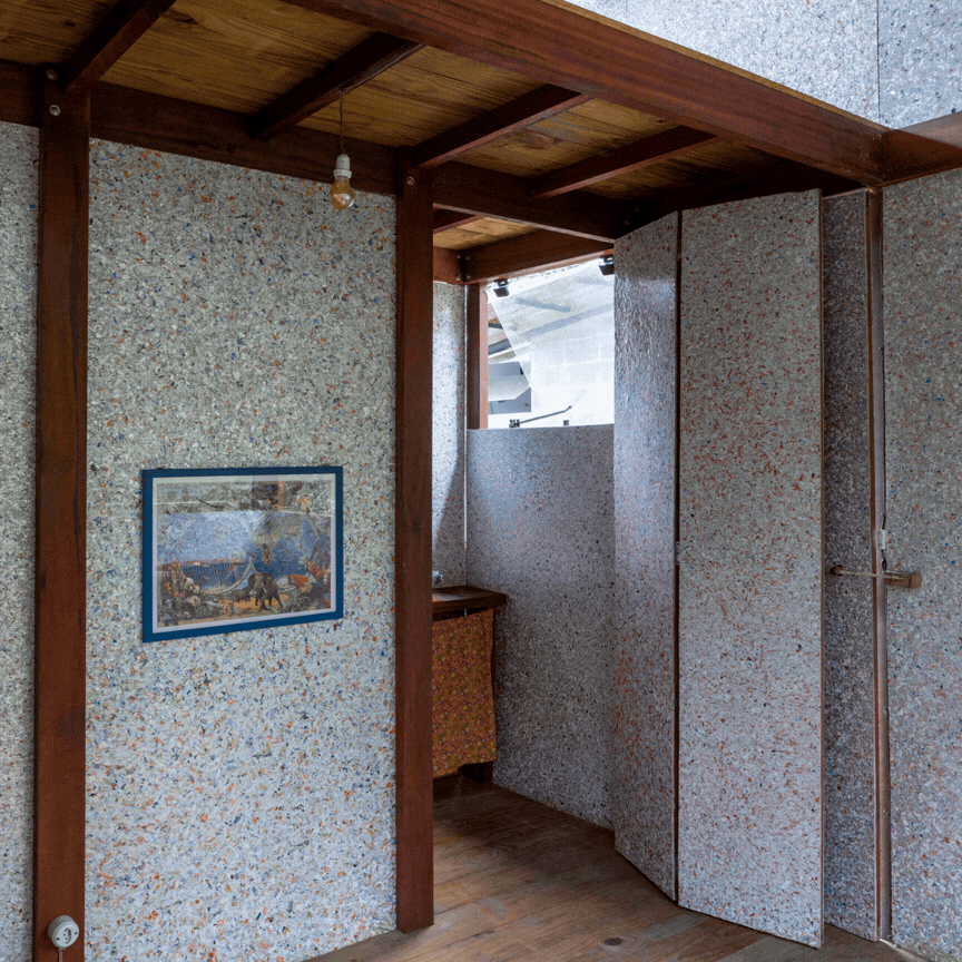 O telhado, do mesmo fabricante, também é de material reciclado. O piso de assoalho de madeira se estende pelo quarto, mezanino e banheiro, onde a banheira é o único elemento em alvenaria. A escada para o mezanino, inclinada como uma escada de marinheiro, ocupa apenas um metro de projeção.