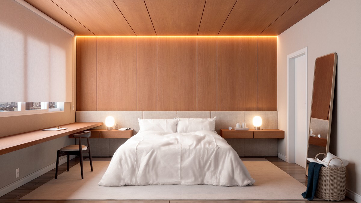 Com texturas agradáveis ao toque, esta suíte máster de 127 m² foi planejada pela designer de interiores Daniela Colnaghi como um refúgio onde o descanso é primordial. Para isso, ela apostou em um painel amadeirado que adiciona sensação de aconchego e contribui para o conforto acústico do ambiente.