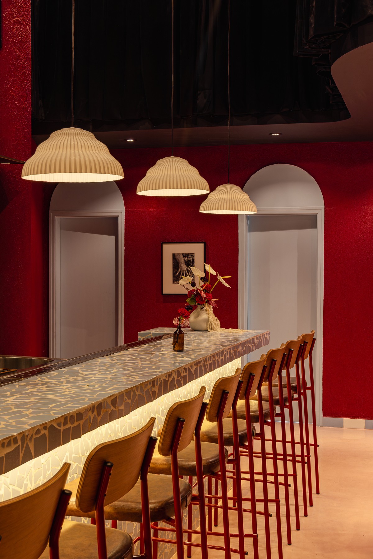 Da janela, é o horizonte que define o tom do projeto. O azul se desdobra como uma paisagem contínua, diluindo as fronteiras entre interior e exterior, realidade e ficção. Aqui, não estamos apenas em Marselha: estamos também dentro de Vinte Mil Léguas Submarinas, um clássico escrito por Júlio Verne. Essa é a referência literária que guia a imaginação de Anthony Authié, fundador do estúdio responsável pelo projeto, que descreve o espaço como “uma reinterpretação livre de uma paisagem subaquática”.
