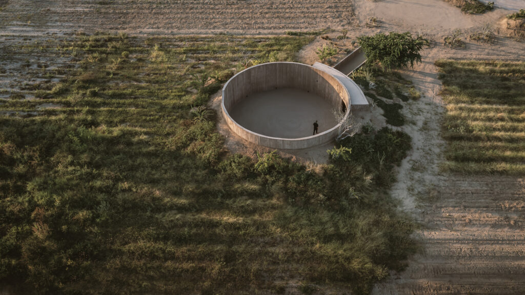 O espaço é definido principalmente por um anel de concreto, um piso sem revestimento que revela a terra natural, e um “teto” aberto ao céu, elementos que reforçam uma conexão transcendental com a terra e o cosmos.