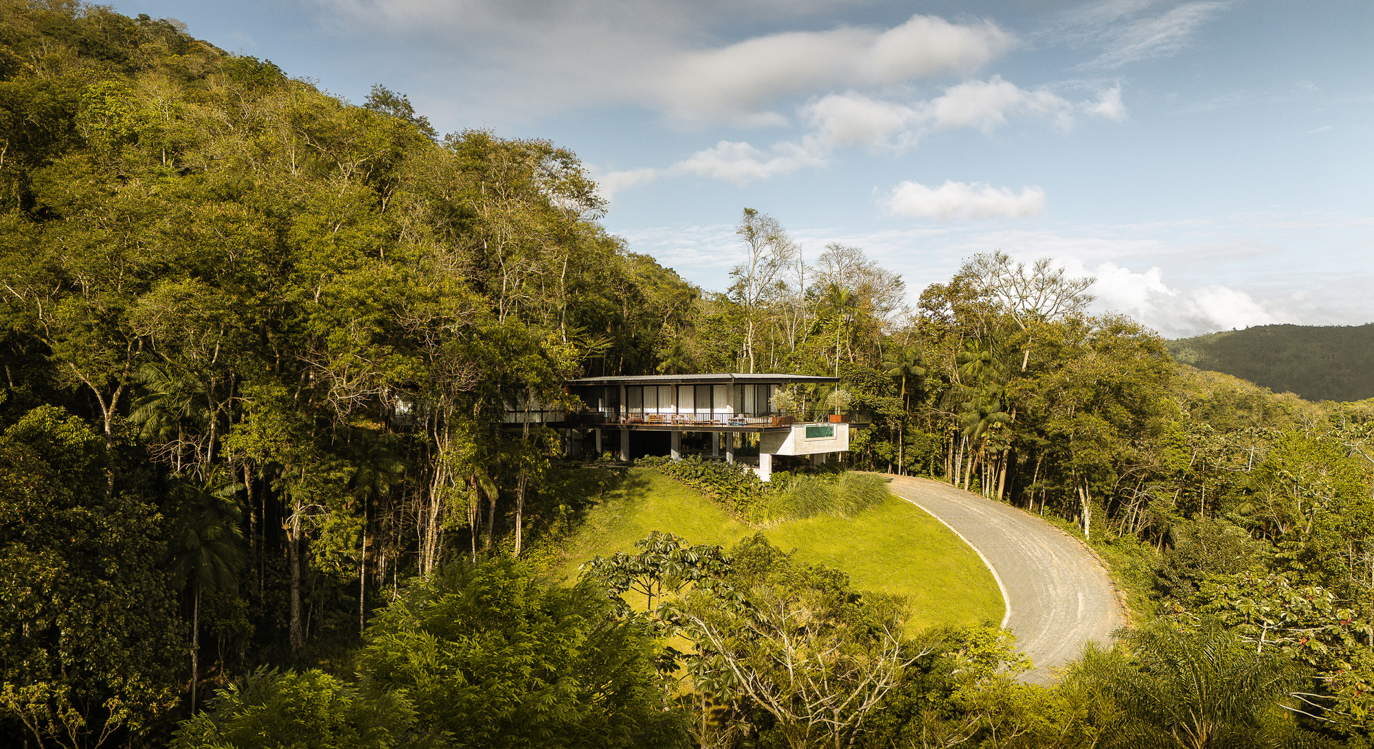 Descrição enviada pela equipe de projeto. Um gesto leve pousado sobre a montanha. Entre as dobras verdes do Morro da Turquia, em Pomerode, esta casa nasce do encontro íntimo entre arquitetura e território. Não se impõe: ela desvenda a mata, entra nela com cuidado, observa, escuta — e só então se posiciona. O projeto parte de um princípio simples e potente: intervir o mínimo para revelar o máximo. Mais de 95% da vegetação original foi mantida; apenas o essencial foi tocado para que a casa pudesse pousar na topografia sem feri-la.