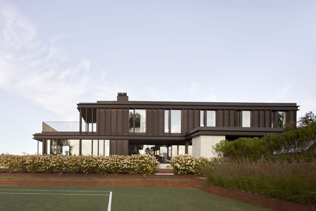 A planta tem forma de “L”, posicionada paralelamente ao limite nordeste do terreno. Com isso, as salas e os quartos ficam voltados para a vista e para o sol da tarde. Essa configuração permite distribuir a piscina e a quadra de tênis em diferentes níveis do terreno. O lado interno do “L”, voltado para a piscina, cria um átrio de entrada, enquanto as áreas de serviço ficam discretamente alinhadas junto ao limite com o vizinho. No andar superior ficam os quartos e áreas privadas.