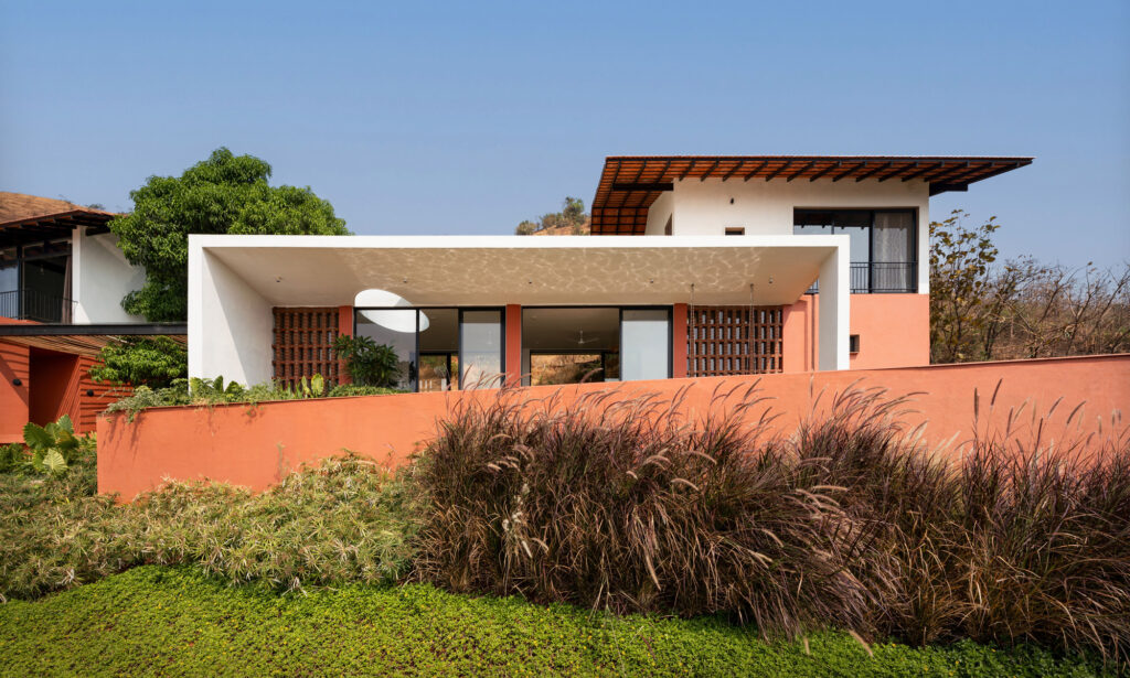 Em Prakriti, é possível sentir a presença da floresta dentro e ao redor da casa, por meio de vários elementos que se conectam à natureza — seja pela vista, pelos cheiros ou pelos sons. A casa, com suas cores de terracota, parece uma criatura da terra nascida do solo fértil das montanhas Sahyadri, que gera várias “filhas” verdes ao seu redor. Projetada para aproveitar o clima local, a casa tem dois telhados inclinados e beirais largos que protegem do sol forte nas varandas e sacadas, além de permitir a entrada de luz suave pelas janelas de tijolos vazados (jaalis). Os ambientes têm ventilação cruzada, garantindo conforto térmico o ano todo. Os telhados de telha de barro ajudam o ar quente a sair naturalmente. O tijolo local — simples, com textura e durável — é usado em grande quantidade, trazendo sensação de aconchego. A pedra Shahabad, típica da região e econômica, aparece em vários padrões pela casa. O telhado tradicional de telhas de barro remete às técnicas locais de construção. A decoração interna, simples e branca, traz um toque acolhedor de identidade indiana aos espaços.