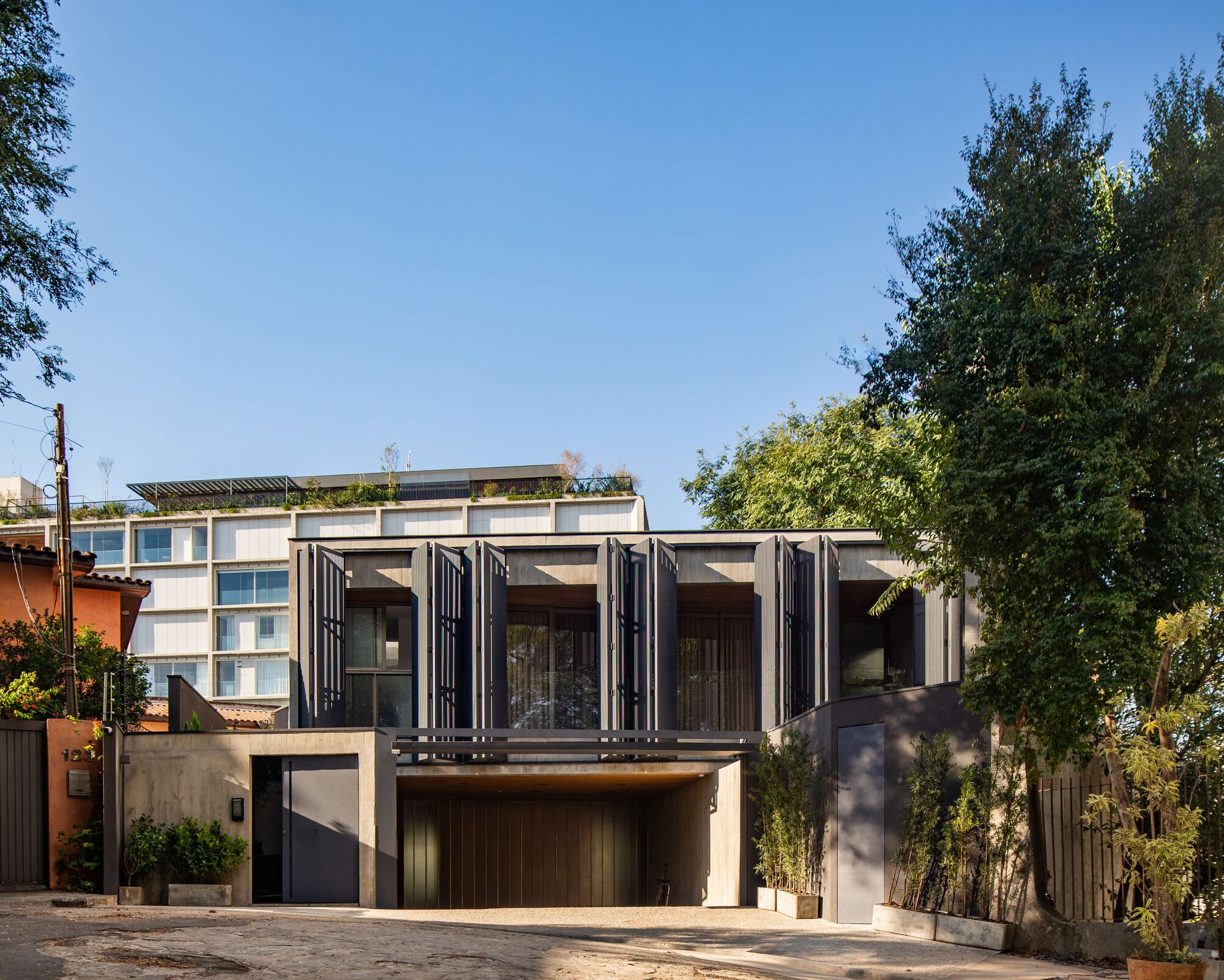 Concebida para uma jovem família, ela surpreende em tamanho, aproveitando do declive para estruturar três níveis de uso: área social e de serviços na cota de acesso, escritório, academia e brinquedoteca na cota mais baixa e, por fim, dormitórios no primeiro andar, oferecendo vista para a copa das árvores e privacidade.