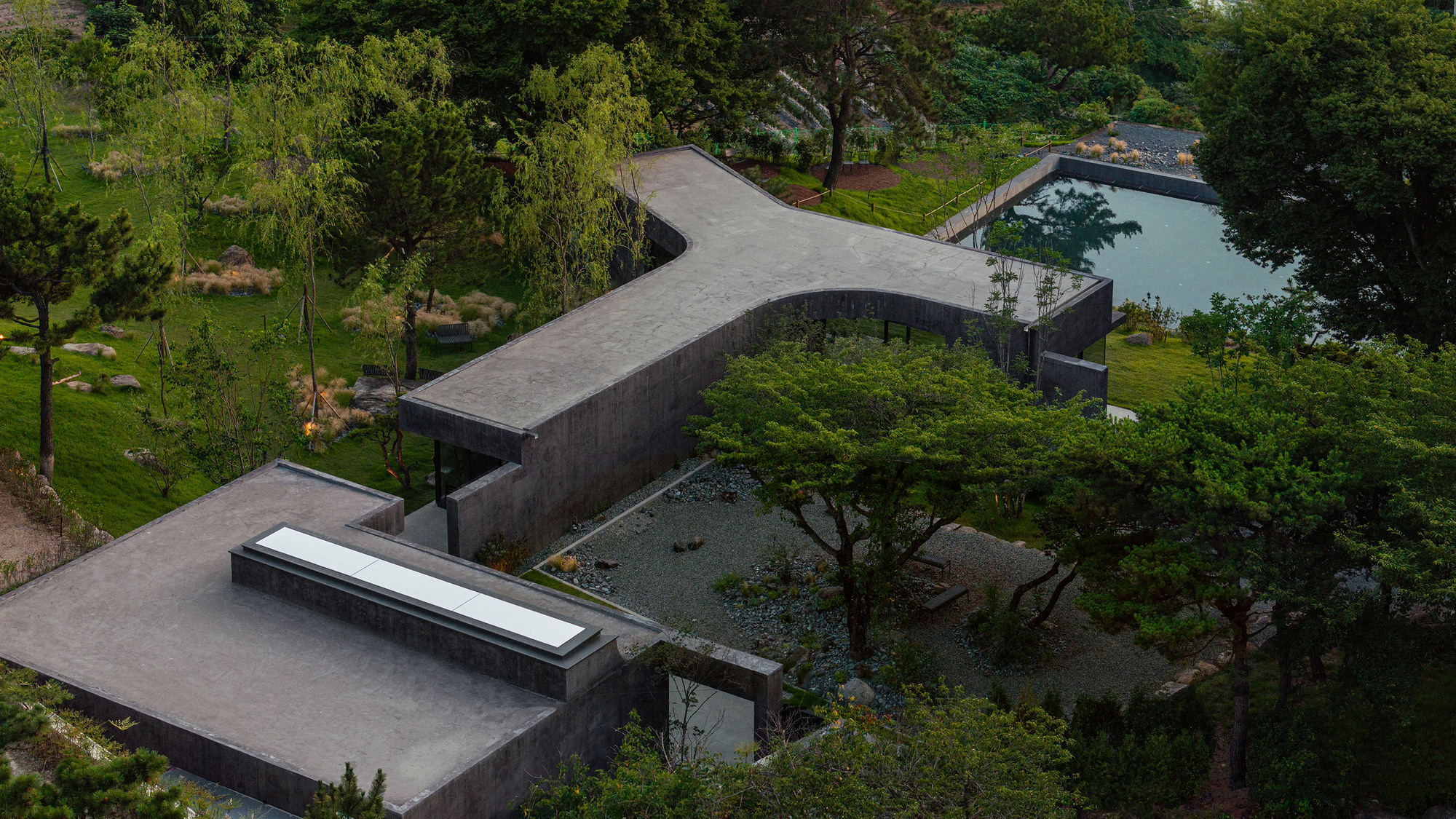 Arquitetura Minimalista – O projeto exigia dois edifícios em dois lotes vizinhos. Cada um acompanha a inclinação do terreno, com uma diferença de nível de um metro entre eles. O método construtivo foi simples: parede, pilar, piso e cobertura. Apenas esses quatro elementos foram utilizados. Um longo muro foi construído ao longo da encosta, dividindo o terreno e conferindo escala à grande área aberta. De um lado, um pátio limpo recebe os visitantes; do outro, um jardim mais desordenado revitaliza uma floresta fragmentada. Em vez dos pinheiros perenes, foram plantados salgueiros, reforçando a percepção das mudanças sazonais.