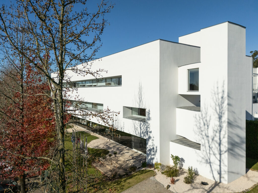 O espaço interior é feito de transparências e partilha de espaço. Reconfiguramos a volumetria, consolidando a ideia de um bloco maciço em ETICS, sulcado por vãos profundos que abrigam o interior da luz do sol. Soleiras e capeamentos foram executados em zinco. Adicionamos um corpo estranho, o elevador, como um corpo estranho à massa original.