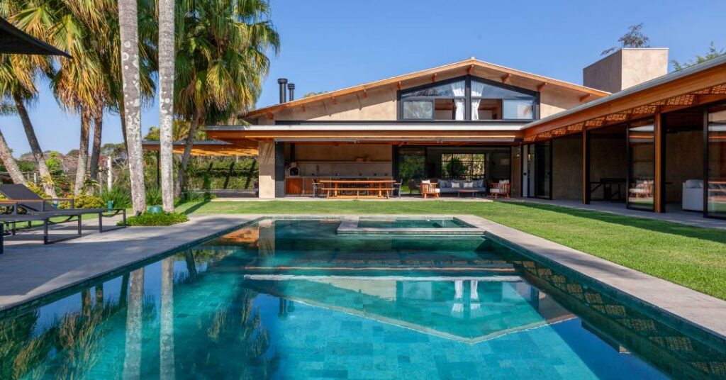 A área da piscina – com pedra Lazzy da Palimanan – se estende sem desníveis até o interior da casa, por meio de um piso contínuo em granito rústico, reforçando a integração entre dentro e fora.