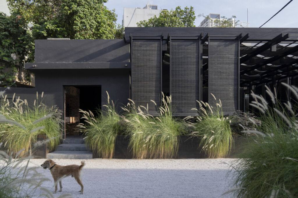 Essa paleta de materiais vai além da estética: ela molda a experiência espacial. Os visitantes chegam por um hẻm (beco vietnamita), ritmo urbano típico do lugar, que se abre em um generoso pátio onde a arquitetura recebeu uma camada de cinza carvão sobre os edifícios existentes, criando uma sequência coesa que conecta o showroom, os espaços para eventos e os escritórios. Inspirado na lógica dos pátios tradicionais vietnamitas, o espaço externo para eventos favorece a ventilação natural e a permeabilidade visual, com cortinas de bambu no teto e telas de estopa que suavizam a luz e o movimento.