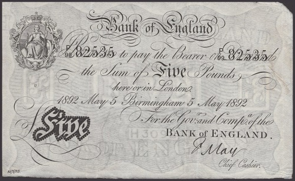 De acordo com especialistas da casa de leilões Noonans Mayfair, trata-se do único exemplar emitido em Birmingham. “A nota está sendo vendida por um antigo colecionador de cédulas raras do Banco da Inglaterra, e acreditamos que seja a nota de £ 5 de Birmingham mais rara existente”, diz a empresa.