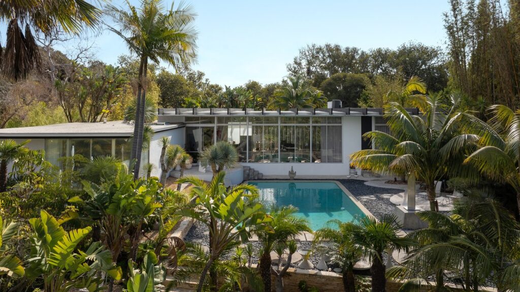 Com cerca de 480 m², a Strick House abriga quatro suítes, uma sala de estar envidraçada, biblioteca de pé-direito duplo e piscina. Ao assumir o imóvel, os Boyds preservaram a planta original, atualizando apenas os eletrodomésticos e acabamentos. Detalhes datados, como o linóleo verde da cozinha, os carpetes dourados nos quartos e a tapeçaria rosa listrada do banheiro principal, foram substituídos por pisos de palmeira, em referência direta à linguagem material de Niemeyer. O mobiliário, por sua vez, é composto por peças de época da coleção do casal, que também atua como paisagista e coleciona arte.